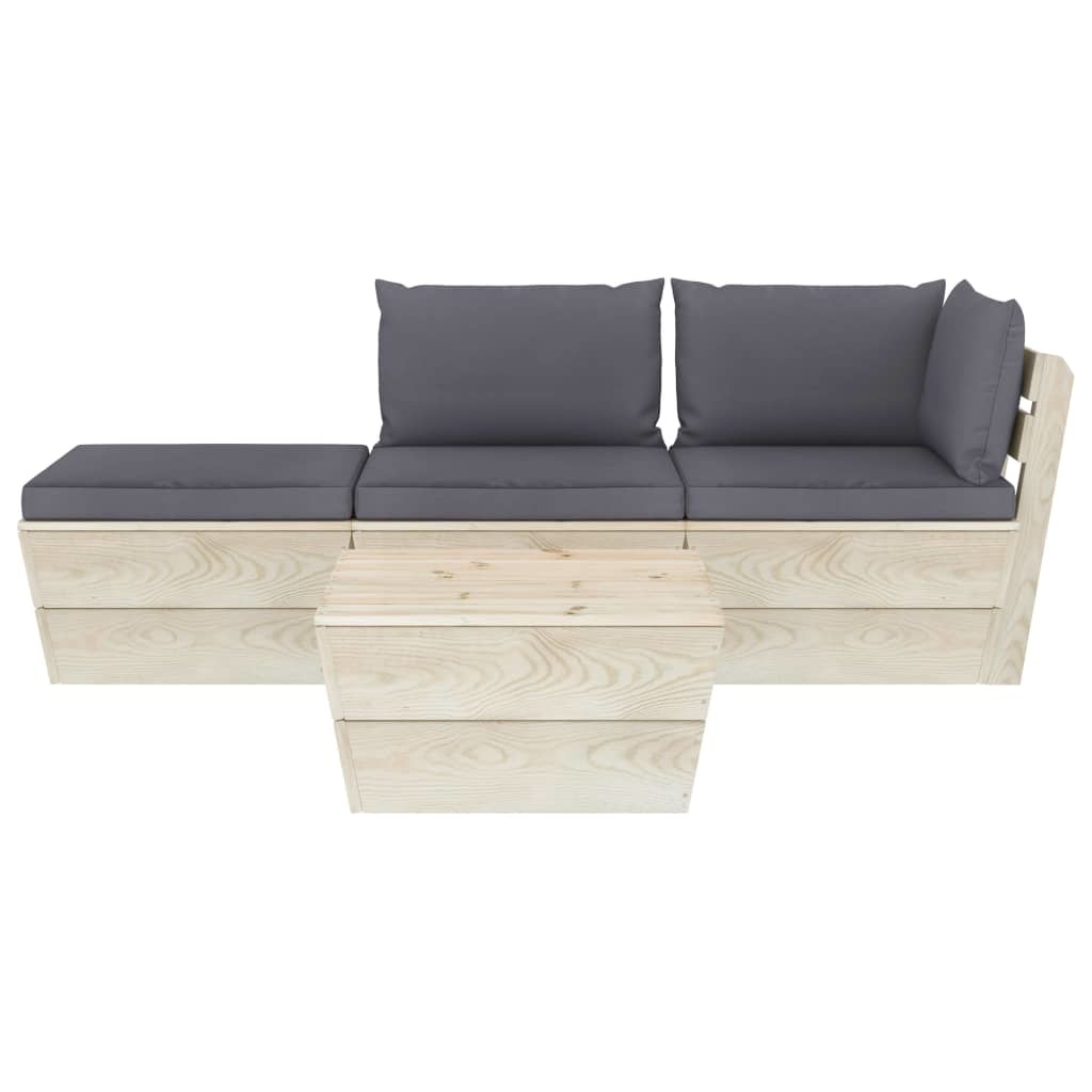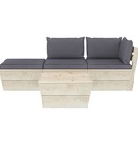 De tuinmeubelset is gemaakt van geïmpregneerd vurenhout waardoor hij duurzaam en stabiel is. Deze set heeft een massieve constructie en vereist weinig onderhoud. Het stevige tafelblad is ideaal om eten en drinken binnen handbereik te houden. Dankzij de 100% polyester bekleding en dikke vulling zijn de palletkussens zacht en zeer comfortabel. Bovendien maakt het modulaire ontwerp het mogelijk om de set in elke gewenste samenstelling te plaatsen.