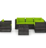 De pallet loungeset is gemaakt van geïmpregneerd grenenhout waardoor hij duurzaam, weerbestendig en milieuvriendelijk is. Deze set heeft een massieve constructie en vergt weinig onderhoud. Gecombineerd met dik gevoerde kussens biedt deze meubelset het hoogste comfort. Het modulaire design maakt het mogelijk om hem in elke gewenste samenstelling te plaatsen.