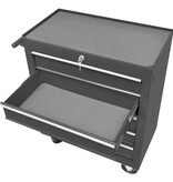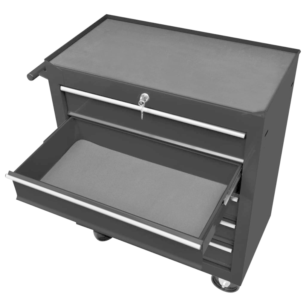 Dankzij het geïntegreerde slot kunnen alle lades tegelijkertijd worden vergrendeld, waardoor voorkomen wordt dat ze per ongeluk kunnen openen wanneer de trolley wordt verplaatst. Twee van de zwenkwielen hebben remmen. De robuuste bovenkant van de wagen is een geweldige plek om gereedschap binnen handbereik te houden. Er zit ook een handig handvat aan de zijkant om de gereedschapswagen te kunnen duwen.